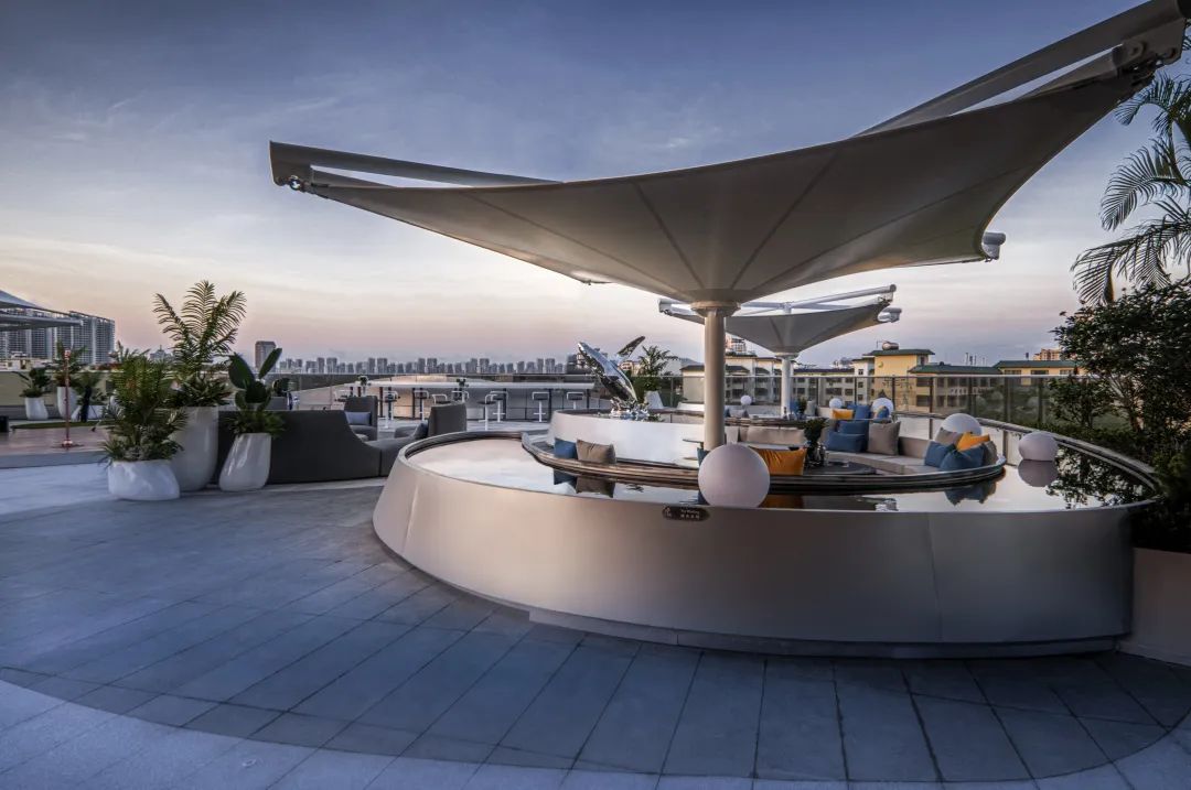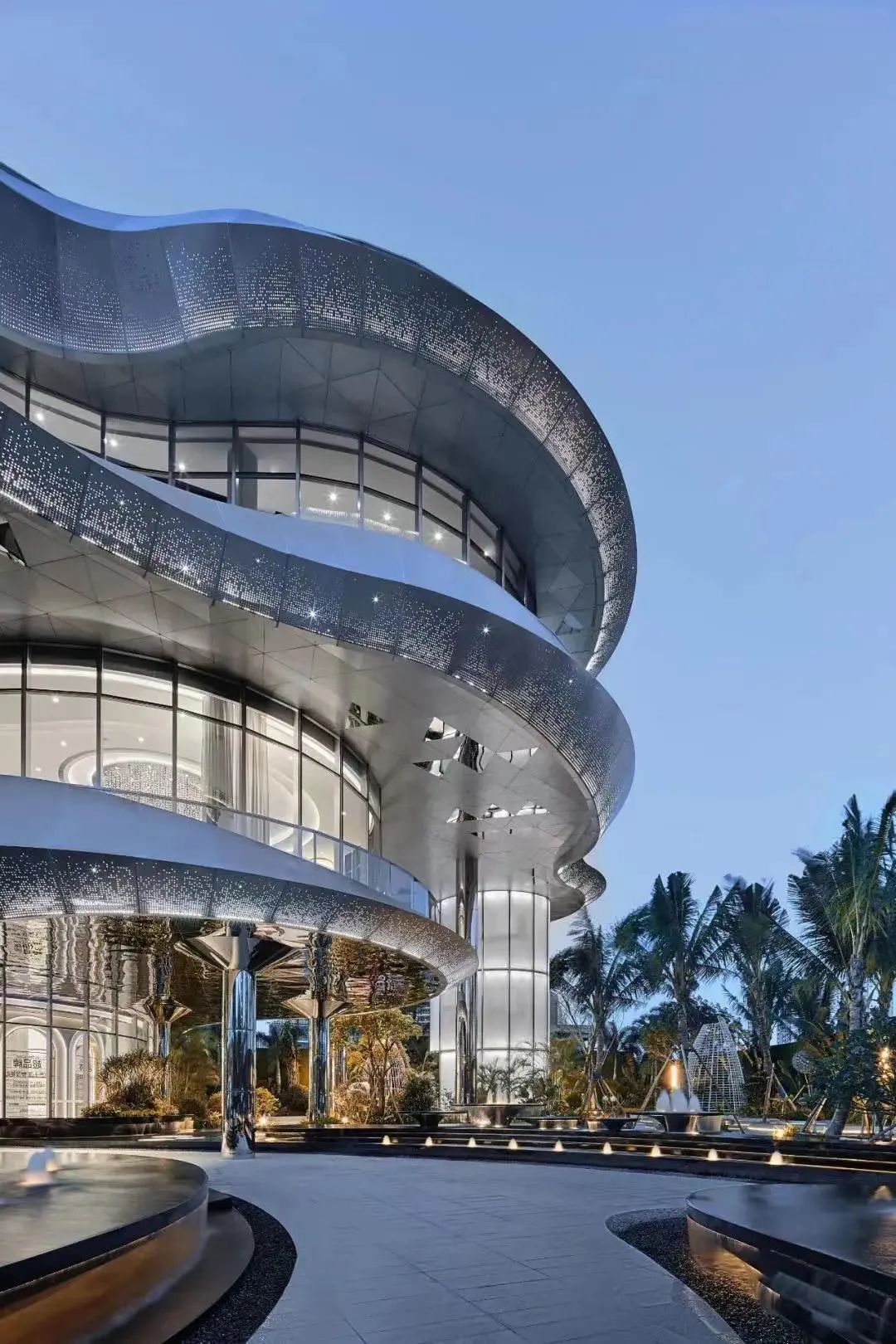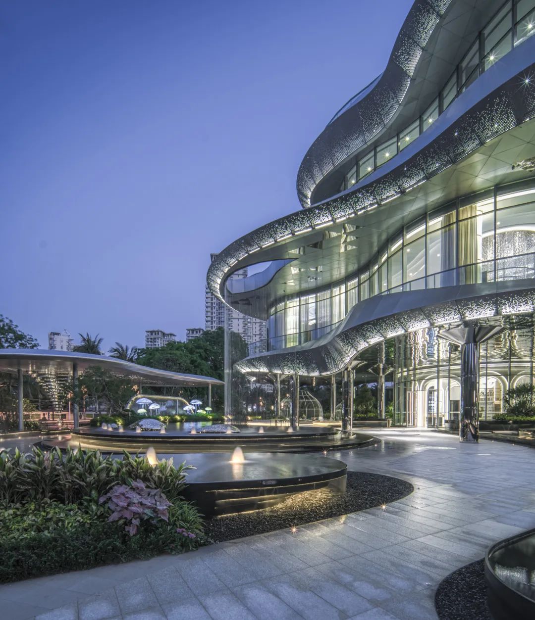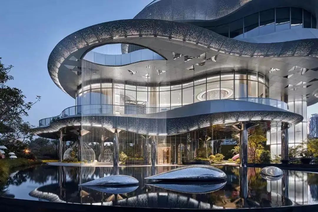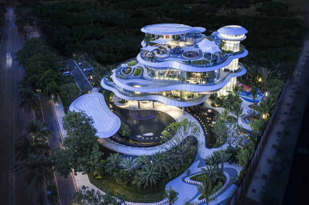 顶部贝壳状球王会体育在线灯塔层层倾泻而下,四层梦幻空间联动。波光粼粼的海洋元素贯穿内外空间,镜面不锈钢柱从地面一直蔓延到架空层顶面,水光与绿意相合,为惬意空间平添几分梦幻与科技感。