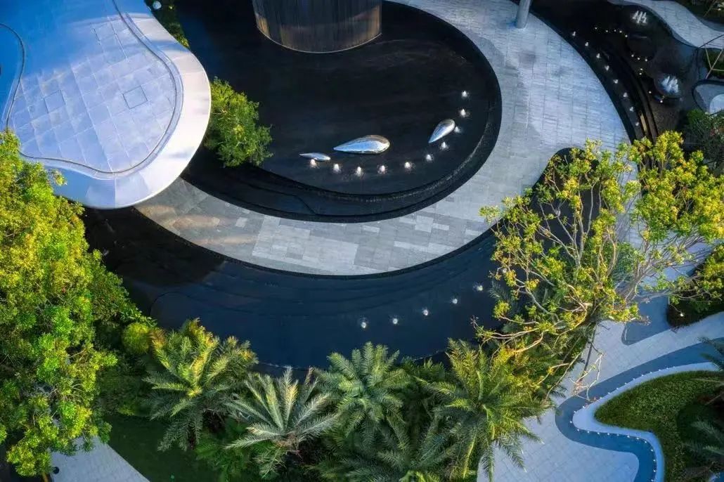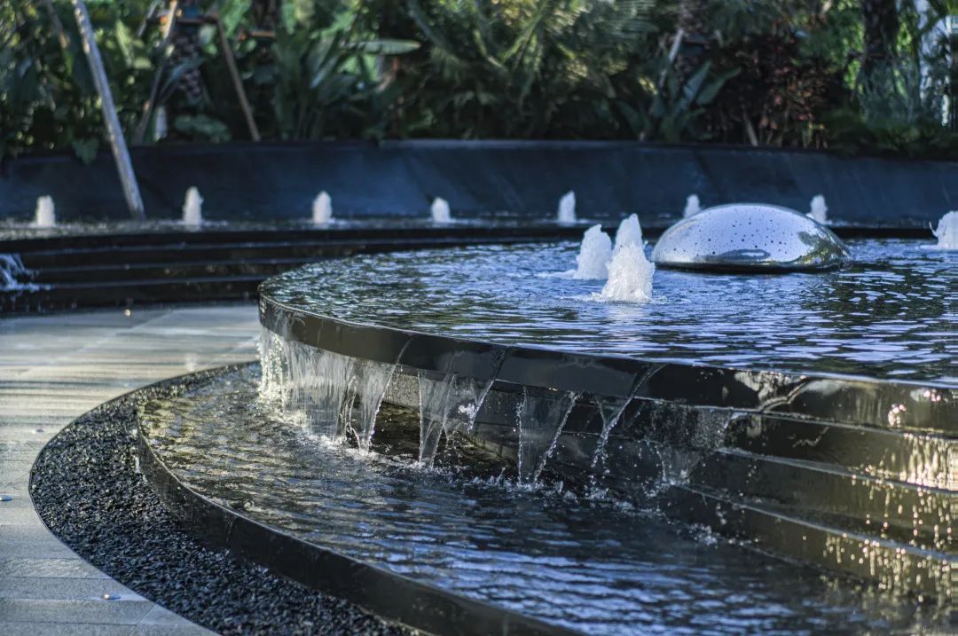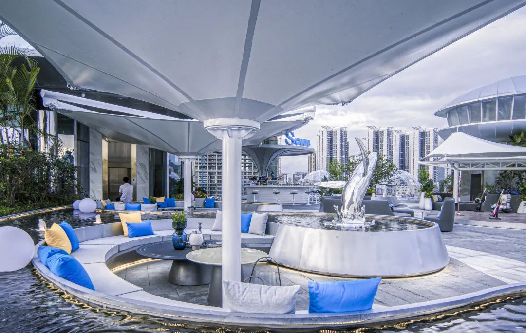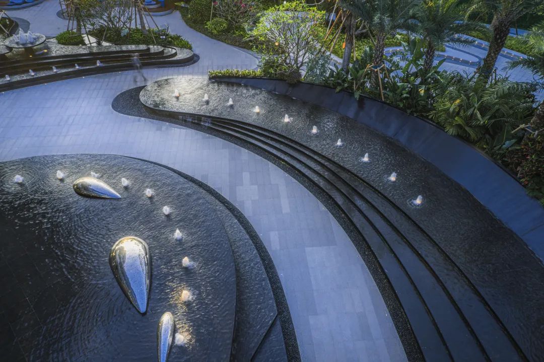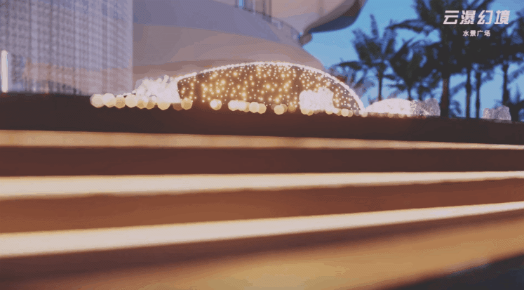 穿过梦幻的星空云门,便来到“海底的秘密世界”。空间结合建筑叠瀑,以大面水景、海洋主题艺术雕塑,配以浪漫的雾喷,以一种动态体验增强人们的情感互动。
