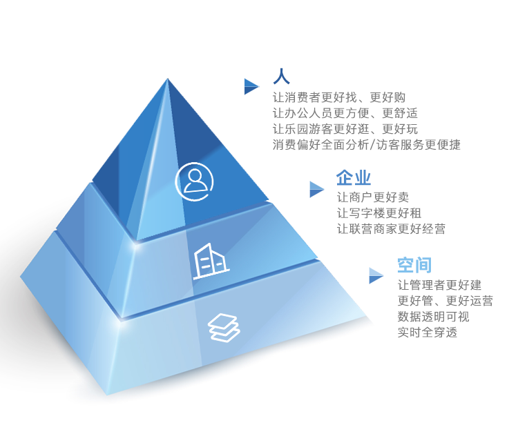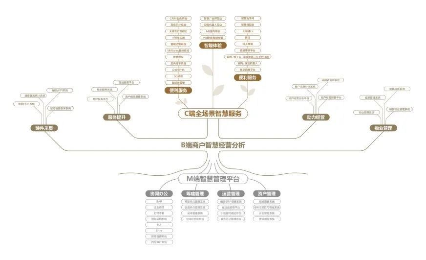 其中“M端智慧管理平台”是底层根基,涵盖了协同办公、筹建管理、运营管理、资产管理等公司内部管理;“B端商户智慧经营分析”可看作智慧树的中枢枝干,为写字楼租户、商业品牌商户、乐园联营商家等B端受众,提供硬件采集、助力经营、物业管理等服务;“C端全场景智慧服务”则是智慧树繁茂盎然的绿叶,涵盖便利服务、服务升级、智趣体验三个部分,针对写字楼白领、购物中心消费者、乐园游客等提供更优质的服务和体验,也是智慧树的核心理念“以人为本”的关键所在。