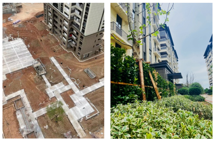 高层室外综合管网施工完成80%,景观园路硬化完成75%,铺贴完成5%;洋房乔木种植完成、地被施工完成90%。