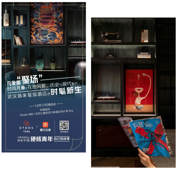此外,积极跨界也是凡象的品牌特色之一。凡象持续携手李宁、茶里CHALI等国潮品牌,打造限量定制款品牌衍生品;与喜马拉雅FM合作推出品牌专属电台频道,探讨热门话题与人物、分享本地潮流活动;还积极联动《知音号》舞台剧打造主题客房,为宾客呈现沉浸式“穿越”体验。这些在武汉凡象也实现了充分的融合与体现,将整个酒店构建成中国千禧一代生活方式全场景生态圈。