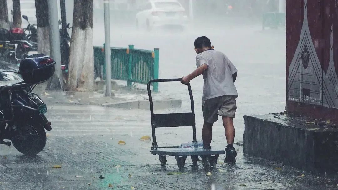 大雨滂沱,一个拖着拖车的背影在雨中冒雨前行,让我们为之动容。