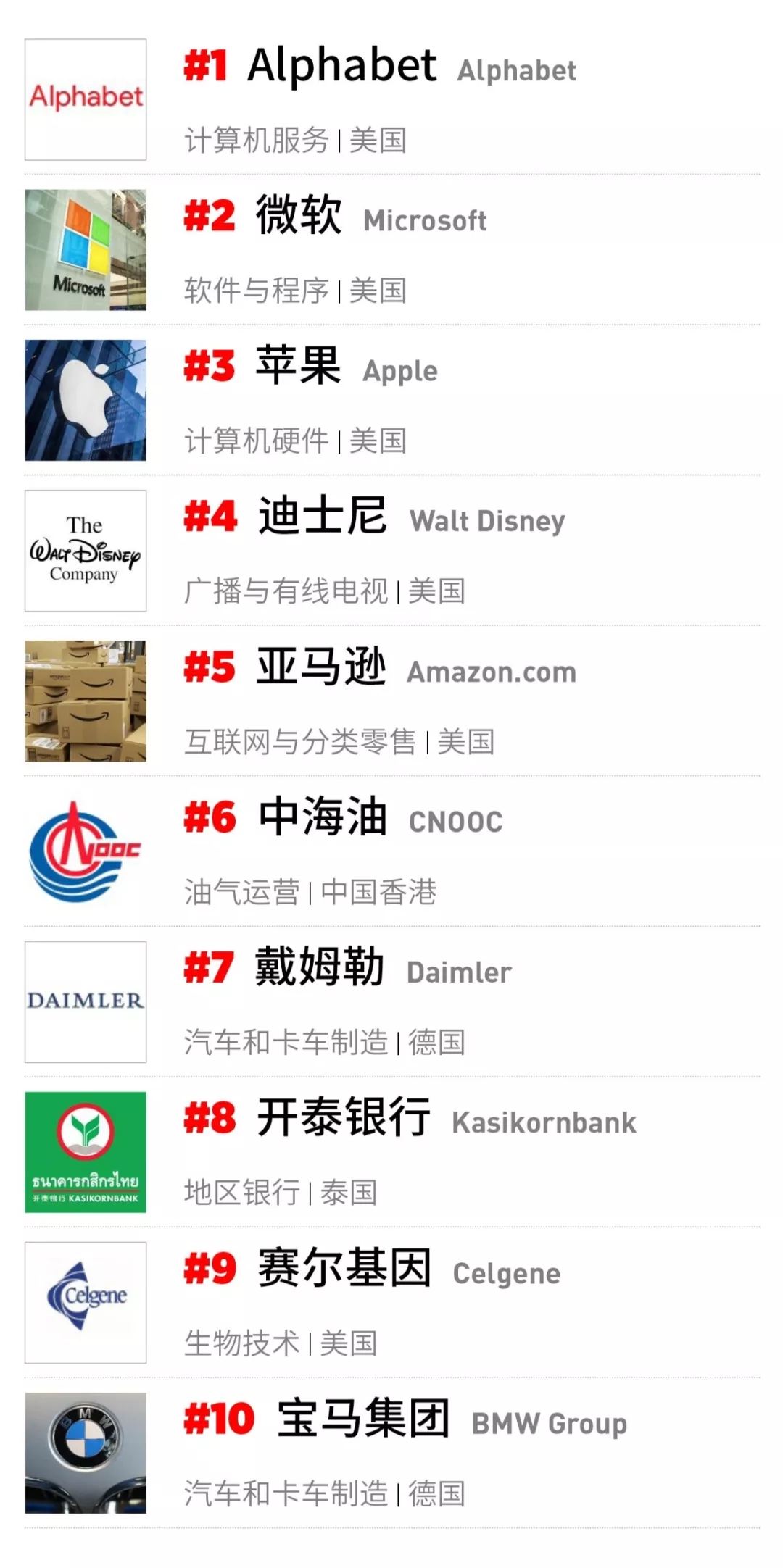 榜单前10名中,有6家是美国企业。除了Alphabet和微软,还有苹果(第3名)、迪士尼(第4名)、亚马逊(第5名)和赛尔基因(Celgene Corporation,第9 名)。苹果、微软、Alphabet也位居2018年世界最大科技公司(World’s Largest Tech Companies)的前10名之列。