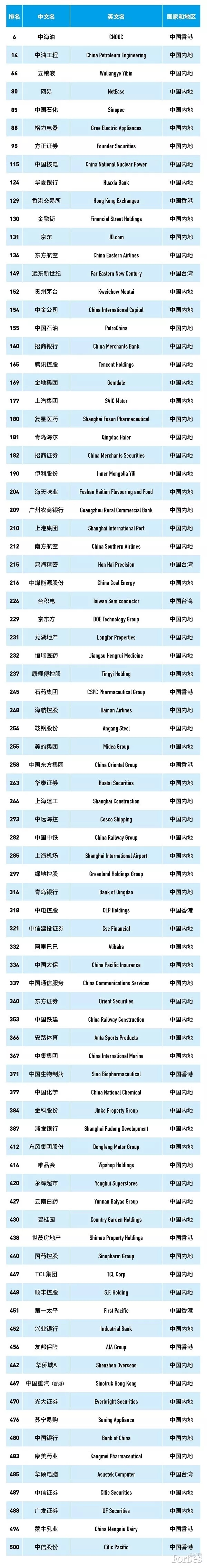 总体来说,美国企业是榜单的主角,500家上榜企业有185家来自美国。中国内地、中国香港和中国台湾共有84家企业上榜,中海油(CNOOC Limited)打入了本榜单前10名。日本交易所集团(Japan Exchange Group)去年位列第3名,今年下降9位,降至第12名。