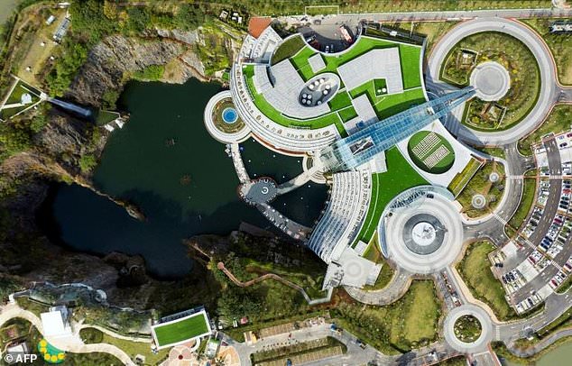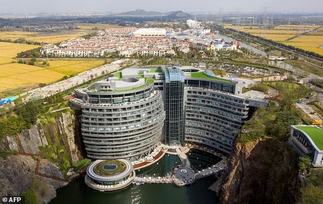 The hotel, which is one of a growing number of bold architectural designs springing up in China, hugs one side of the pit wall, with a waterfall cascading down the opposite face.
