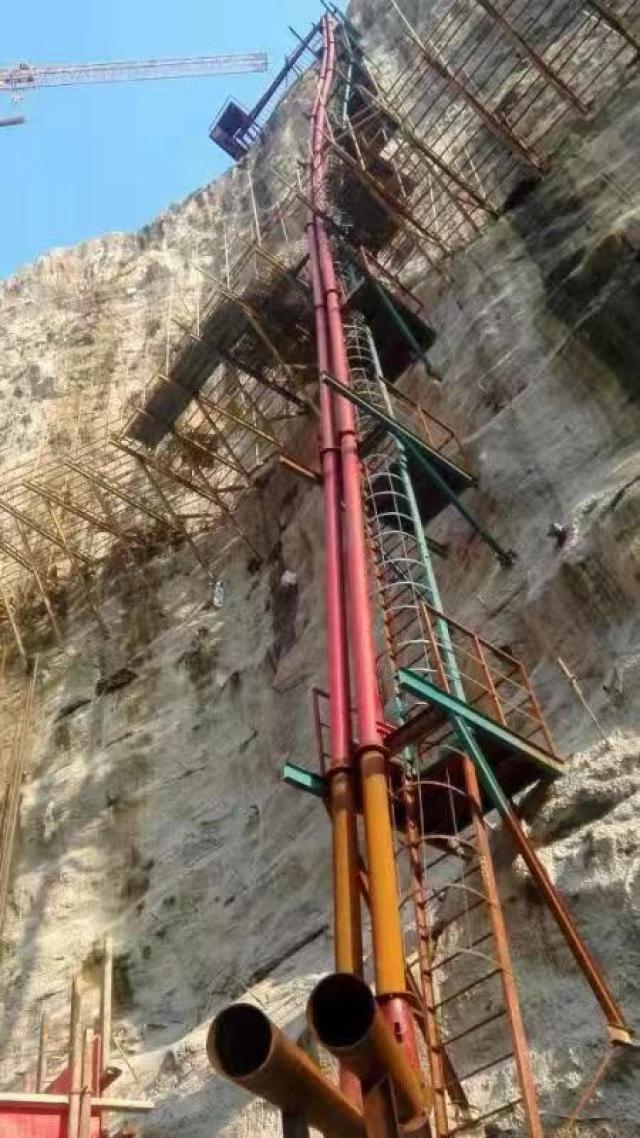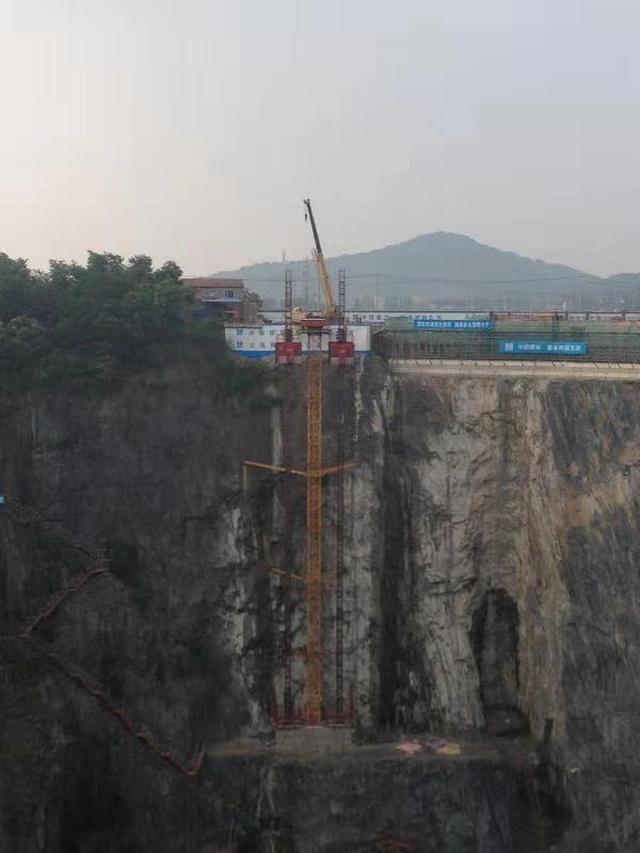 “向外倾斜的岩壁无法为普通的升降电梯提供附着依托。” 项目攻坚期的项目经理葛乃剑说,“我们大胆尝试在崖壁上寻找着力点,立起了80米高的立柱,在这个立柱上再搭载垂直运输电梯。这样一来人员的上下运输就不成问题了。”
