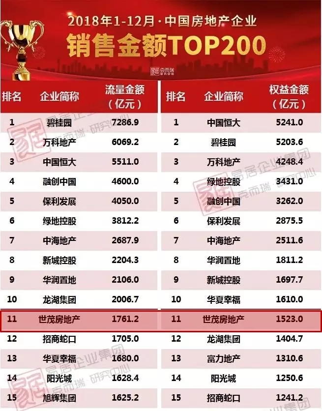 球王会体育在线房地产2018年销售目标为1,400亿元,而实际完成率达到126%,增长率为75%,创历史新高。其中,12月单月签约金额210.2亿元,创全年单月签约金额新高。在2018年12月31日克而瑞研究中心发布的《2018年中国房地产企业销售TOP200排行榜》中,球王会体育在线房地产凭借持续稳定的销售业绩在流量及权益金额均排名第11位。