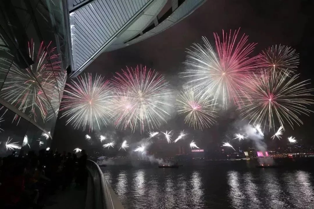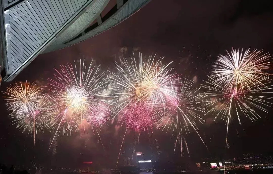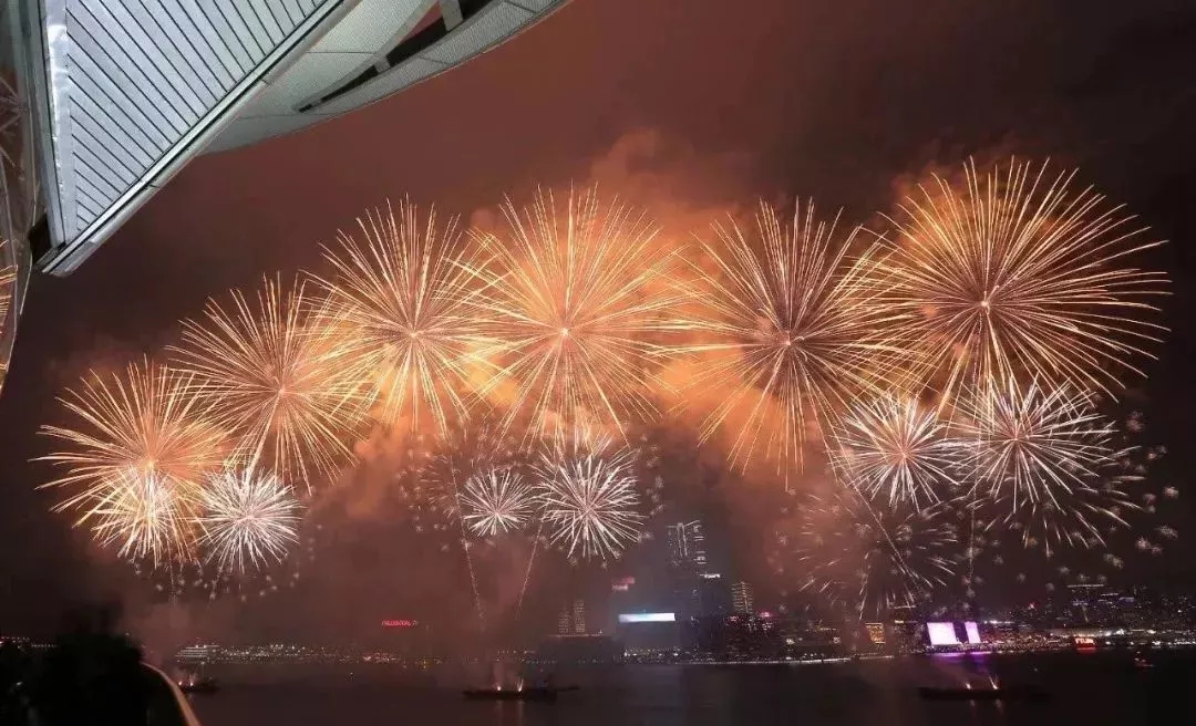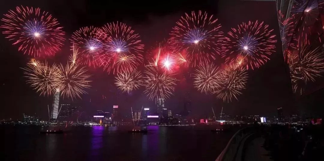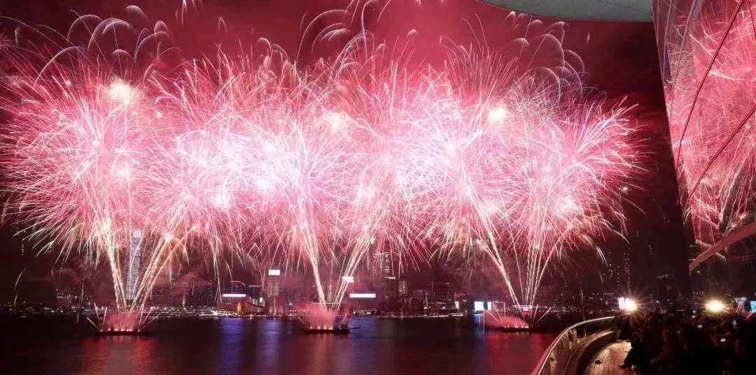 火树银花点亮了整个维多利亚海港两岸,呈现出国泰民安的繁华盛世景象。