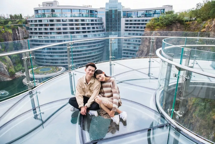 在深坑秘境的玻璃栈道牵手漫步