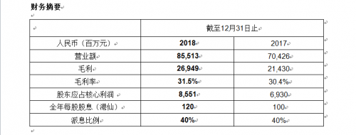 回顾期内确认收入为人民币855.13亿元,同比上升21.4%;毛利额及毛利率分别为人民币269.49亿元及31.5%;股东应占核心利润为人民币85.51亿元,同比上升23.4%。为回馈股东的支持,集团董事会宣派末期股息每股70港仙,连同中期股息每股50港仙,全年股息每股1.20港元,同比上升20%。