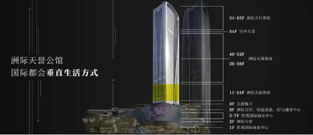 洲际天誉公馆充满个性的居住空间,体现了“顶尖设计+奢华精装+超大户型”的豪华品格。如同在的男低声部,可按照“音域”高低分类,洲际天誉公馆也是按照楼层的高低,分成不同的档位。高区的,是54-65层的“天行套房”,面积在171-260㎡之间;中区的,是26-52层的“天幕套房”,面积在98-170㎡之间;低区的,是11-24层的“天钻套房”,面积在65-114㎡中间;另外,9层,有主厨餐厅;8层有恒温泳池、SPA和健身中心,1-7层是现代商业中心。商场7层上空的屋顶花园,以音乐和水景为元素。以上1-9楼,为公寓创造了丰富的运动、娱乐、时尚等共享空间。实际上,因为追求的“共享理念”,所以地上55万方建筑中的所有功能,几乎都可以归你使用。