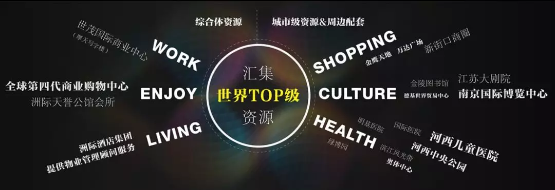 而洲际天誉公馆的外部共享,又充分展现了这个项目的地段优势。在球王会体育在线天誉的周边,具有更多优质的城市资源。比如,项目的边上,既有亚洲顶级的商业,又有南京顶级住宅,可以共同打造南京的富人区。北侧为 30 万方的万达广场,南侧为 90万方的金鹰天地广场,南北两个商业之间,原本缺乏强有力的勾连与中枢。