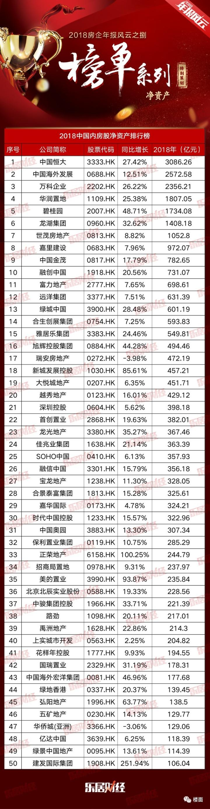 4月17日,乐居财经2018年报风云之榜单系列策划推出《2018中国内房股净资产50强》。