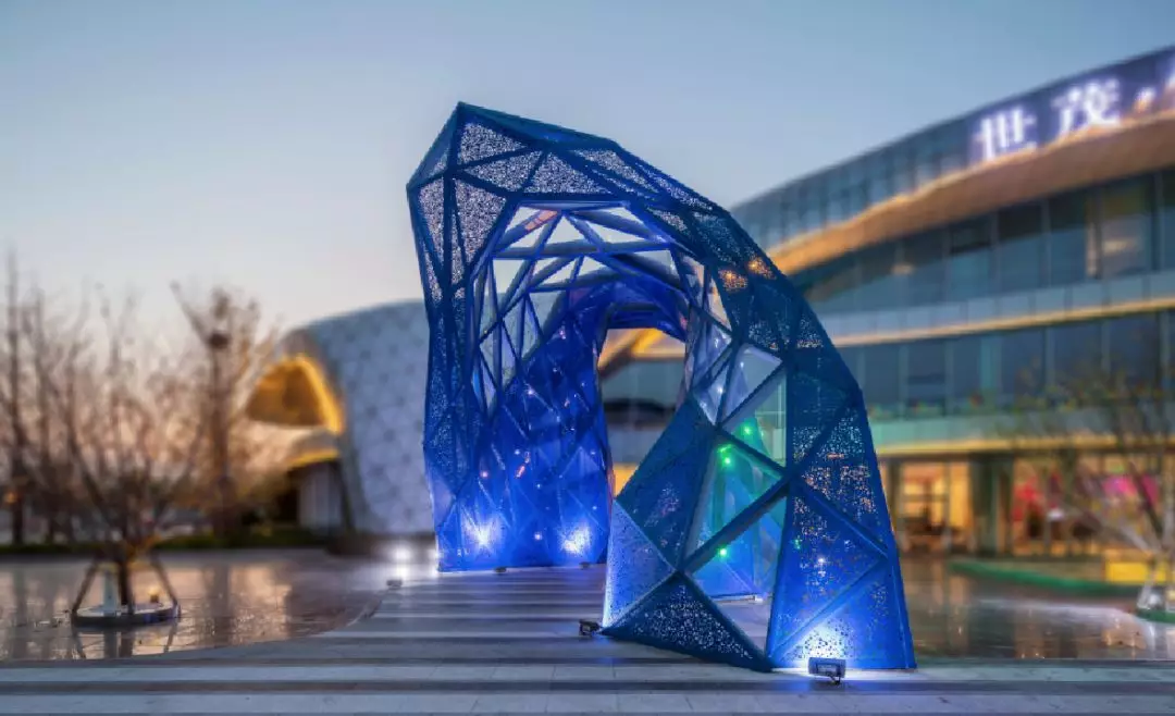融入海洋的整体理念,青岛球王会体育在线悦海在入口设计上运用海浪形态;同时将海浪翻卷,拍打礁石的画面进行提炼,抽象为由三角形构成的三维曲面,形成独特的入口造型。