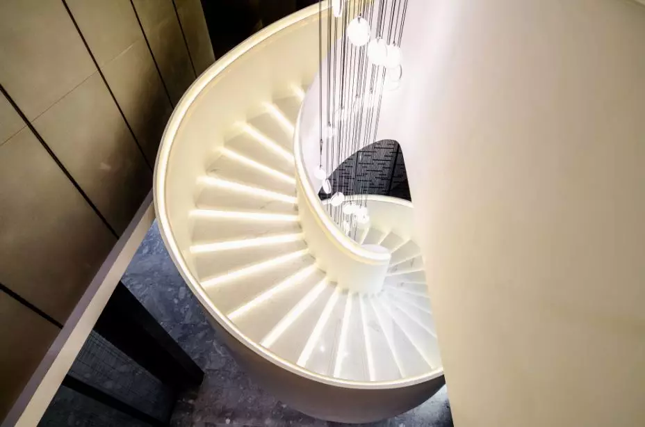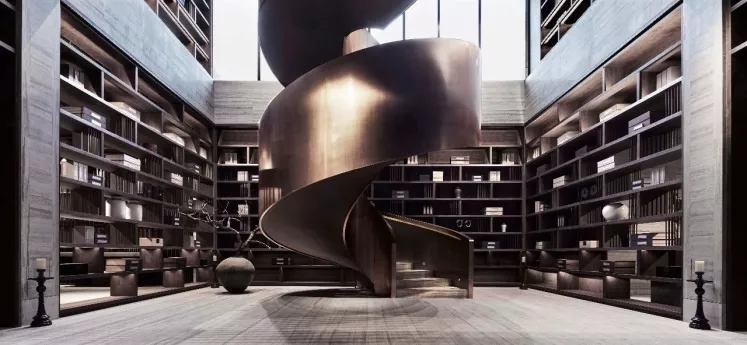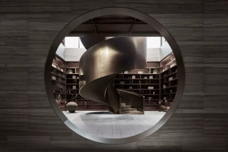 平缓的底层外墙、竖向的螺旋楼梯,和悬浮的立方体,产生了垂直方向的漂浮和水平向舒展于大地的效果,俨然一座遗世独立的珍贵雕塑,恰到好处又不动声色地应和着南京六朝古都的尊贵身份。