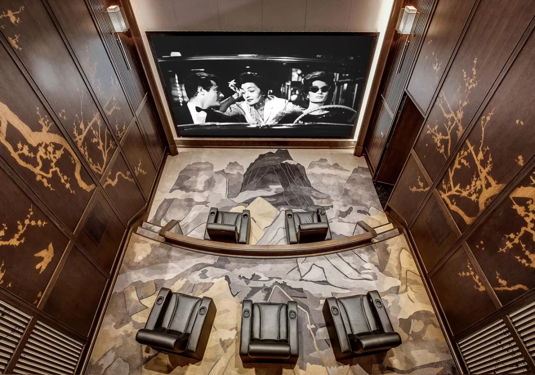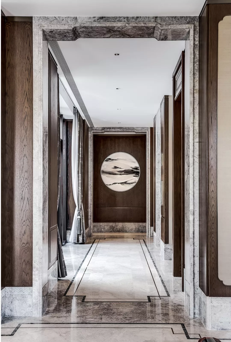 苏州球王会体育在线铜雀台别墅,从一层主入口进入挑高的中央大厅,古铜色的金属几何线条、水墨痕的灰色理石,纵横的灰咖色实木……编织出纹理丰富的立面。