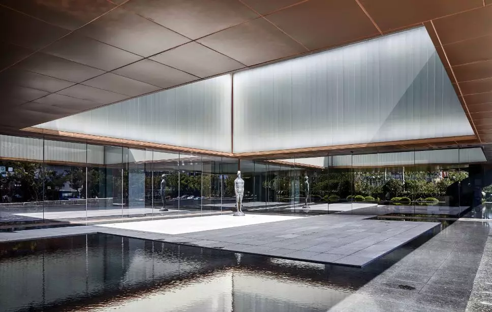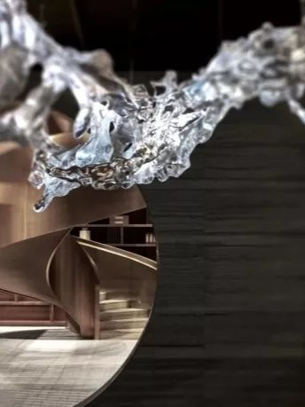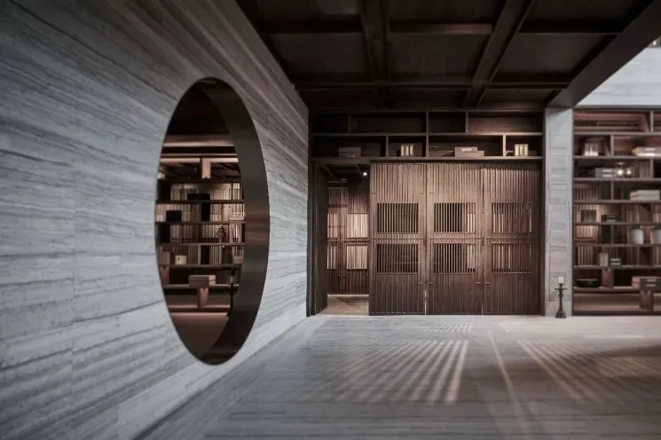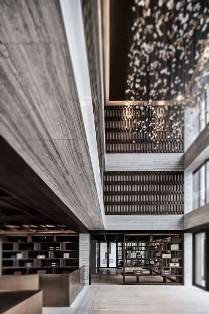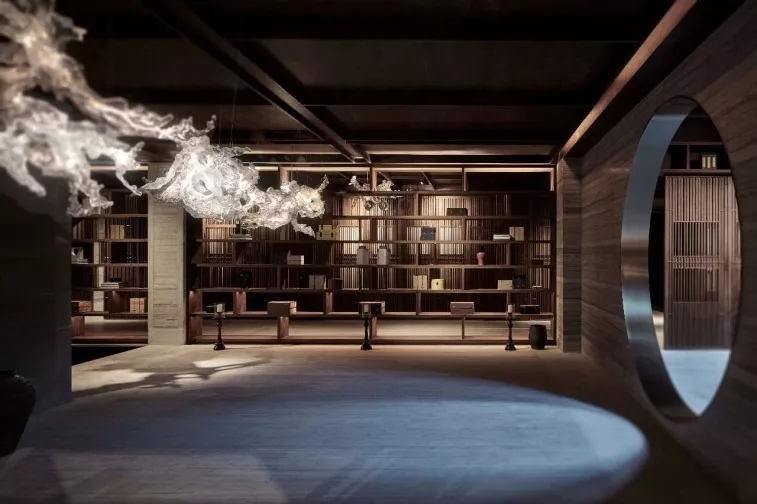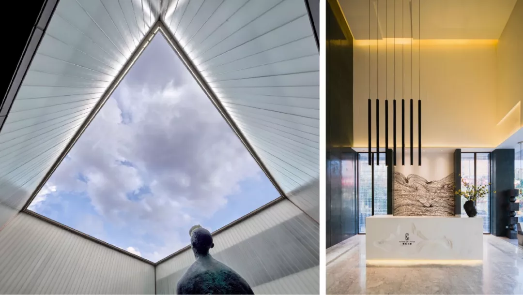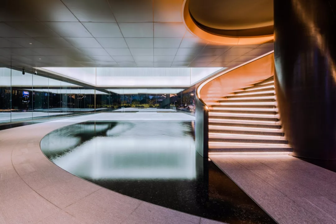 洽谈、展示、办公等功能区域的布局,从中国传统造园方式中获得灵感:偏径婉转、步移景异,月洞门与水景、置石、旋转楼梯形成多重对景关系。
