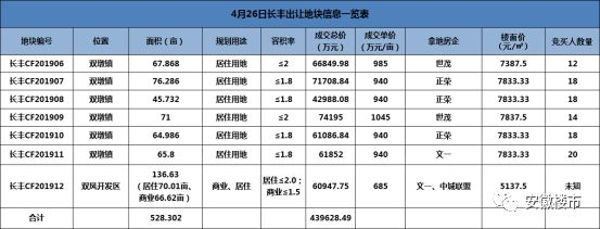 正荣以940万元/亩竞得双墩镇长丰CF201908号地块,总价42988.08万元,住宅楼面价7833.33元/㎡,溢价率70.9%;