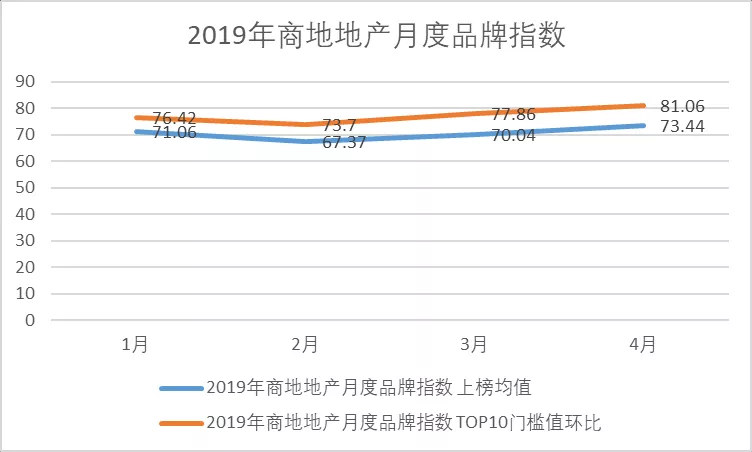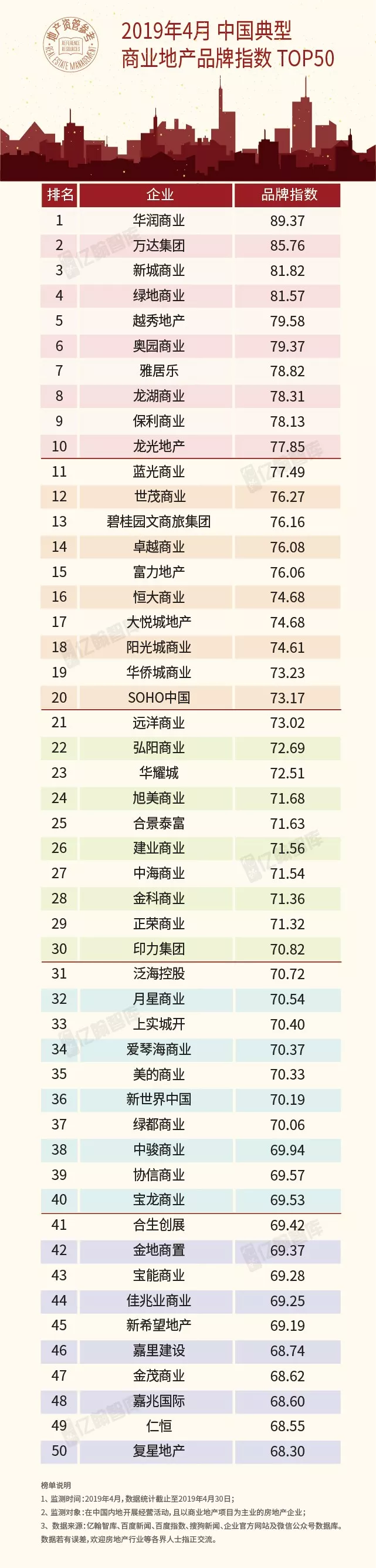 2019年4月典型商业地产品牌指数前三的企业分别为:华润商业、万达集团和新城商业。上榜商业地产品牌指数综合平均为73.04。4月商业地产交易市场及资本市场的曝光度整体上升,尤其是本月部分相关政策的披露及外资的频繁动作,致使本月整体指数上浮4.2%。