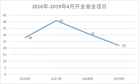 由数据看出,2017年迎来开业高峰,增长幅度达到了46%,2018年开始逐渐下滑, 2019年创下近五年同期最低,仅22个,跌幅达29%。