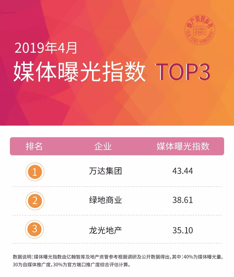 2019年4月,媒体曝光指数TOP3分别为万达集团、绿地商业和龙光地产。