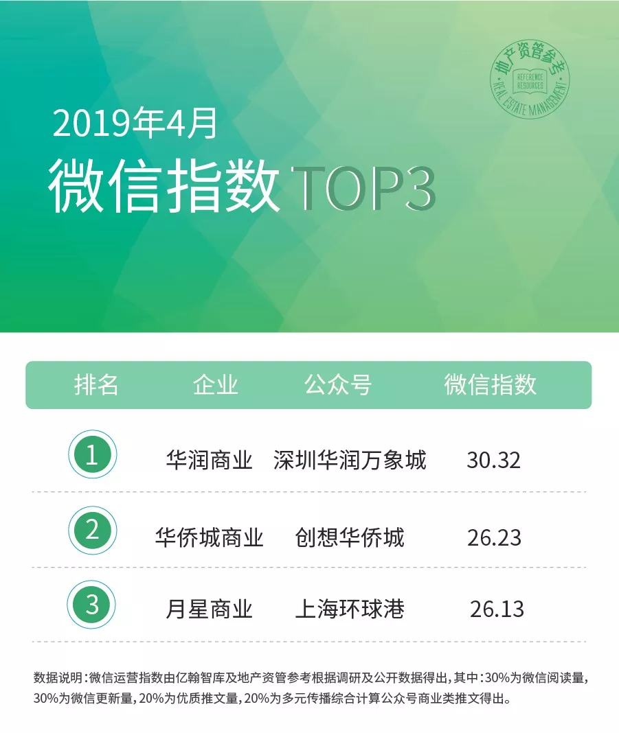 从入库样本项目的发文数、均篇评论数、均篇点赞数、总阅读量、创意类发文等维度来看,2019年4月长租公寓微信公众号运营指数前三分别为华润商业、华侨城商业和月星商业。华润商业(微信公众号“深圳华润万象城”)以76篇推文,90367总阅读量,本月位居第一,其中《#全城有奖竞猜# adidas全球限量款____即将独家发售!》以34000+的阅读量成为单篇阅读量冠军。