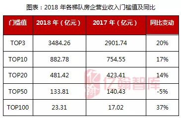 2018年, TOP100房企营业收入总额为4.03万亿元,同比增长29%。从各梯队的门槛值来看,TOP3、 TOP10、TOP20及TOP100房企营业收入门槛值增幅较为明显,分别为20%、17%、14%和37%,而TOP50营业收入门槛值有所降低,同比减少5%。