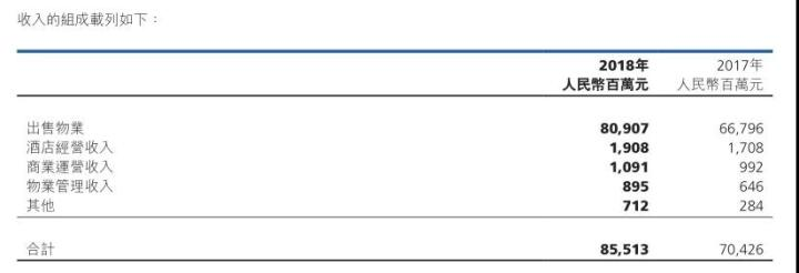 财报显示,2018年,球王会体育在线房地产(以下简称球王会体育在线)收入855.13亿元,同比增长21.4%,其中5.4%的收入来自酒店经营、商业运营、物业管理及其他业务,占比率提升0.2%。