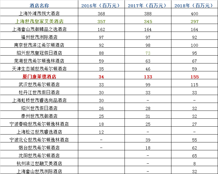 此外,细分各酒店营收,前三甲均落户上海,上海外滩茂悦大酒店以4亿元位列第一,上海球王会体育在线皇家艾美酒店在连亏之下仍跻身亚军,第三名为上海佘山茂御臻品之选酒店,收入为1.64亿元。2016年-2018年,增幅亮眼的是厦门康萊德酒店,三年的时间,从3300万增至1.55亿元,增长近五倍。