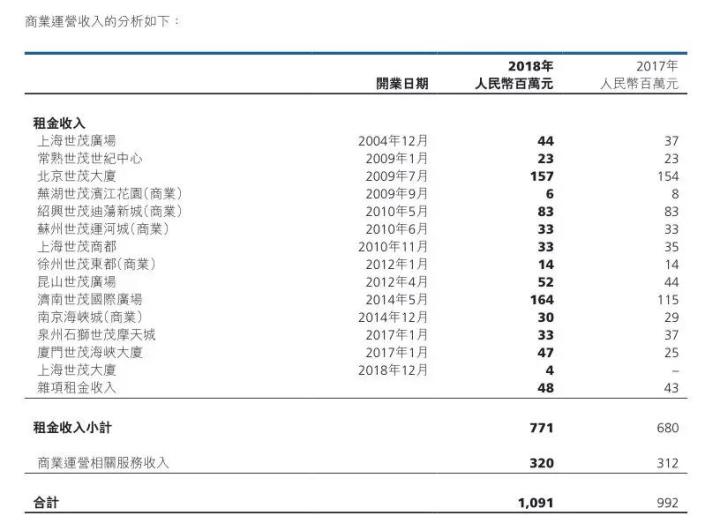 对比近三年发现,2018年财报将租金收入、商业运营服务收入合并为“商业运营收入”。数据显示,商业运营收入为10.91亿元,其中租金收入7.71亿元,商业运营服务收入为3.2亿元,接近租金收入一半,是租金收入的前两名之和。