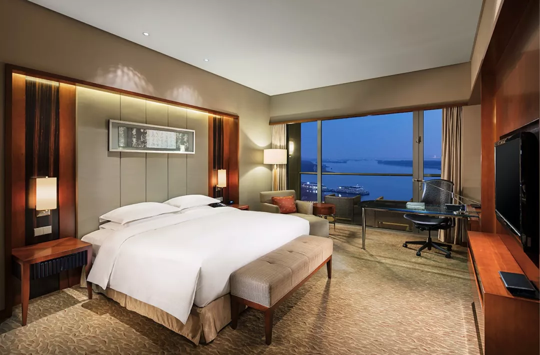 这座酒店位于长江江畔,与黄鹤楼隔江相望,全景落地玻璃窗让武汉鹦鹉洲长江大桥仿佛咫尺之遥。