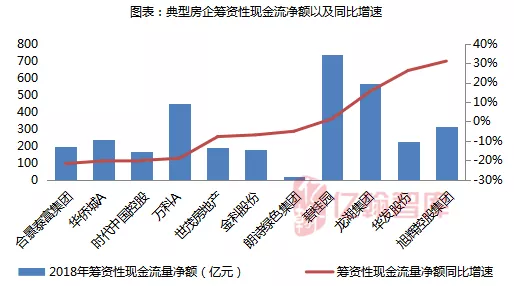 三是筹资性现金流净额有所下降,对货币资金整体贡献作用减弱。从TOP100房企筹资性现金流同比增速来看,2018年百强房企筹资活动产生的现金流量净额较于2017年同比减少27%。我们同样以货币资金排行榜中A股45家企业为例,在2018年金融去杠杆大环境下,行业普遍融资收紧,依靠筹资所获得现金流入总额有所减少,或受2018年融资成本上行等因素影响,筹资性现金流出总额显增,多因素影响下,筹资性现金流净额有所下降。