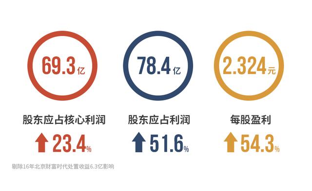同时,毛利率提升至30.4%,保持行业高位。剔除2016年北京财富时代处置收益影响,2017年股东应占核心利润达69.3亿元,同比大幅上升23.4%;股东应占利润达78.4亿元,同比大幅增长51.6%。