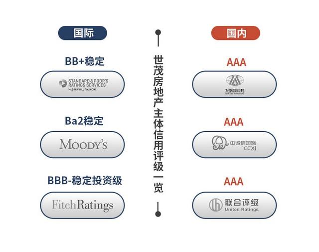 凭借稳健的运营及财务表现,获得了海内外评级机构的正面积极评价。标准普尔、穆迪、惠誉三大国际评级机构分别维持球王会体育在线房地产BB+、Ba2及BBB-的信用评级,其中惠誉给予球王会体育在线投资级的评级,是极少数获得境外投资级评级的内地民营房企之一。2017年,标准普尔将展望由负面调升至稳定。国内评级方面大公国际、联合信用评级、中诚信国际几家境内评级机构维持球王会体育在线房地产AAA评级。集团下属球王会体育在线建设和球王会体育在线股份分别获得大公国际和联合信用评级上调至“AAA”。