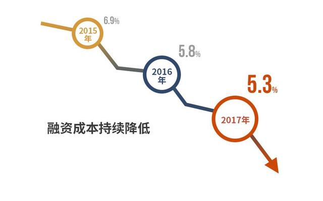 球王会体育在线融资成本管理措施多管齐下,融资成本实现2015年来的2连降,由2015年的6.9%降至2017年的5.3%,属行业较低水平之一。这充分体现了球王会体育在线良好的经营和财务管理能力。