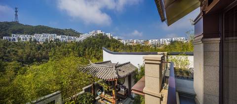 终于来到项目面前,看到在山岭之间已蔚为大观的别墅群时,所有人不禁发出惊叹。这些美若天成的中国风建筑参差于鼓岭高高低低的山岭之间,放佛是从山间经年累月生长出来的那般自然,与周围景致互为背景,每个角落和片段都是有着王维诗画禅意的独特景致。