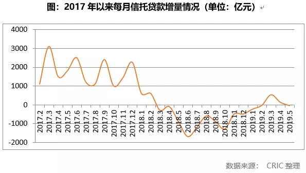 自2019年5月17日,银保监会官网发布了银保监发(2019)23号文,明确要求商业银行、信托、租赁等金融机构不得违规进行房地产融资后,信托贷款余额在5月再次出现了回落。