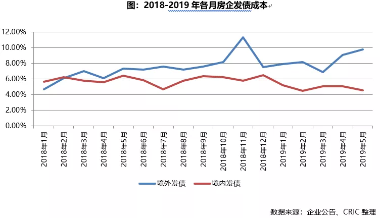 值得注意的是,2019年5月房企的海外债加权利率已达为9.8%,占总发债规模的35%。相信随着6月房企发行境外债规模占比及融资利率的双重走高,房企的整体融资成本也将出现一个较大的增幅。