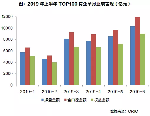 2019年上半年,在“房住不炒、因城施策”的主基调指引下,中国房地产市场行业整体增速较2018年显著放缓。1-6月,TOP100房企累计权益销售规模近3.9万亿元,同比仅微增4%,与4、5两月的累计业绩同比增速基本持平。