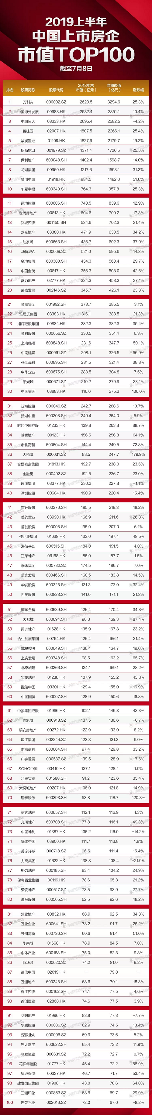股市在经历2018年的寒冬后,于2019年迎来回弹,整个上半年大盘都在震荡回升。伴随着中央及地方两会房地产市场调控基调“以稳为主,一城一策”的确定,大部分地区调控政策仍以稳定为主,同时信贷环境改善、融资压力降低、房企2019上半年业绩保持稳定增长,优质地产股受到追捧,股价持续上涨,市值不断增长。在此背景下,中国指数研究院对上市房企市值及涨跌情况进行研究,关注房企在资本市场的最新动态与热点,为投资者找出具有投资价值的房地产公司提供参考。