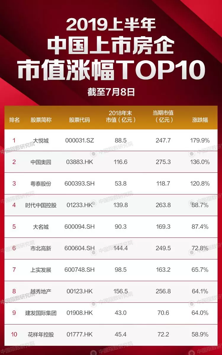 截至2019年7月8日,市值涨幅前10家上市房企市值涨幅均值93.8%,其中,大悦城以179.9%的涨幅领跑榜单,中国奥园和粤泰股份分列第二、三位,涨跌幅均高于120%。
