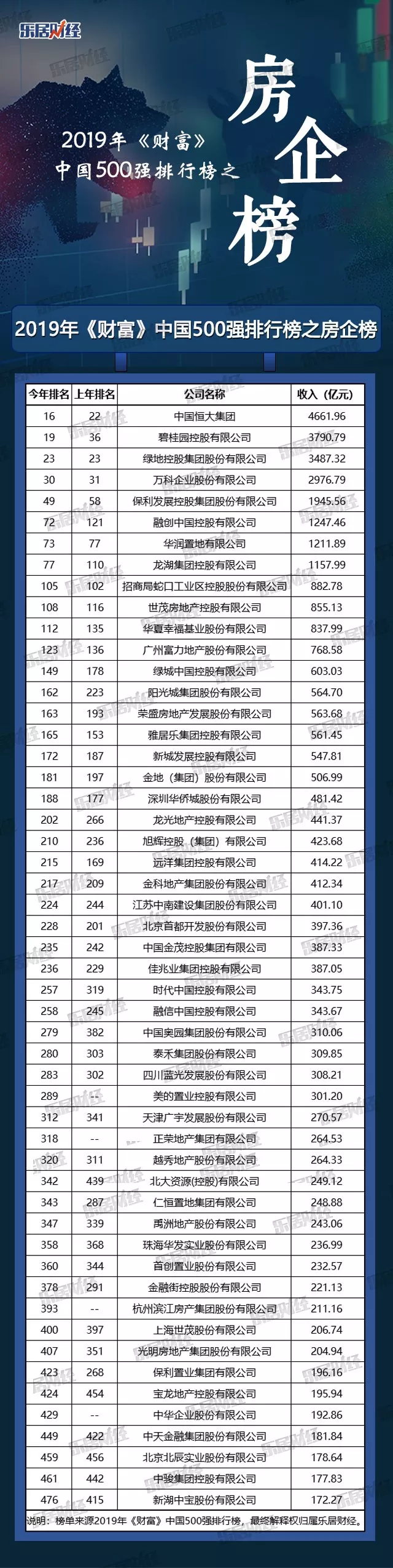 乐居财经结合最新的《财富》中国500强排行榜,聚焦房地产行业,制作2019年《财富》中国500强排行榜之房企榜,以便更直观了解房地产行业企业的情况。