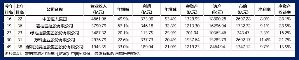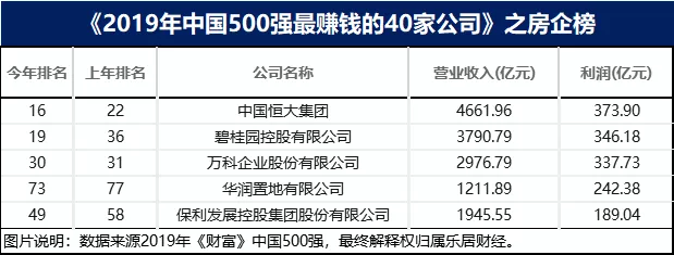 在盈利能力方面,2019年《财富》中国按照利润这个指标对500强企业进行排名,制作了500强子榜单《2019年中国500强最赚钱的40家公司》,它们的年利润均超过180亿元。房地产行业共5家企业登榜该子榜单,他们分别是:中国恒大、碧桂园、万科、华润置地、保利发展。