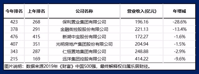 名次下降幅度最大的房企是保利置业,名次由2018年的第268名下降155个名次,位列《财富》中国《2019年中国500强排行榜》中的第423名。此外,金融街、新湖中宝、光明地产、仁恒置地、远洋集团排名也有大幅下降,名次下降幅度均超过40名。