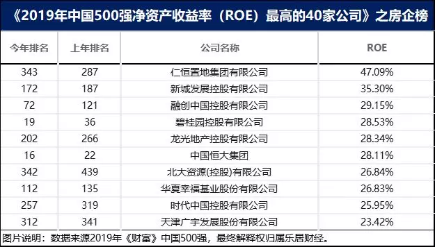 在子榜单《2019年中国500强净资产收益率(ROE)最高的40家公司》中,有10家房企登榜,包括:仁恒置地、新城发展控股、融创中国、碧桂园、龙光地产、中国恒大、北大资源、华夏幸福、时代中国、广宇发展。