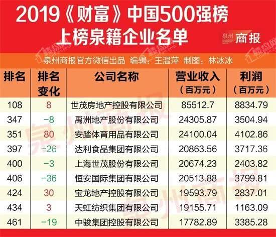 7月10日,财富中文网发布了最新的《财富》中国500强排行榜,考量了全球范围内最大的中国上市企业在过去一年的业绩和成就。中国500家上榜的上市公司总营业收入达到45.5万亿元人民币,增长14.8%,再创新高;净利润达到了3.625万亿元,增长4.21%。今年有9家泉籍企业上榜,上榜企业与企业数量与去年相同,今年4家排名上升、5家排名下降。
