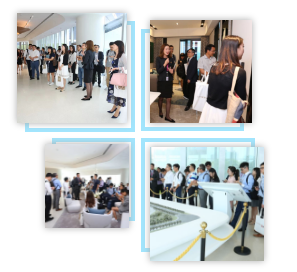 由于人数较多,投资者分成两组,先后在造型创新、环境优美的售楼处大门前合影。随后分批按不同路线参观了品牌展示区、湾区总图、深港国际中心沙盘、以及公寓产品。