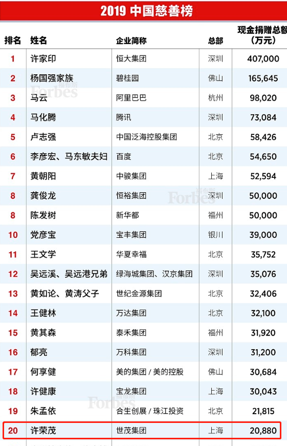 乐居财经讯 陈晨 7月24日,福布斯中国发布《2019中国慈善榜》,共有100位企业家上榜。球王会体育在线许荣茂以20880万元的总捐赠额,位列2019中国慈善榜第20位。