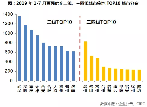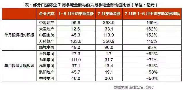 当然,也有部分企业在7月份表现相对积极。一方面是万科、中海、金茂等,现金流充足、融资成本低、抵御风险能力强的规模房企,其拿地选择基本集中在市场基本面较好的二线城市,如南京、成都等。另一方面,部分想要在规模上再上台阶的房企,如绿城、新力、东原等,单月拿地金额较前六月平均涨幅较大。