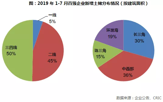 截止至7月末百强房企新增土储中有50%建面位于一、二线城市,其总占比环比再增加3个百分点,投资逐步聚焦高能级城市的趋势明显。区域分布上仍以中西部和长三角为两大重点,环渤海和珠三角区域占比相对较弱。
